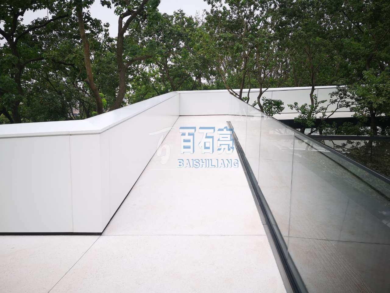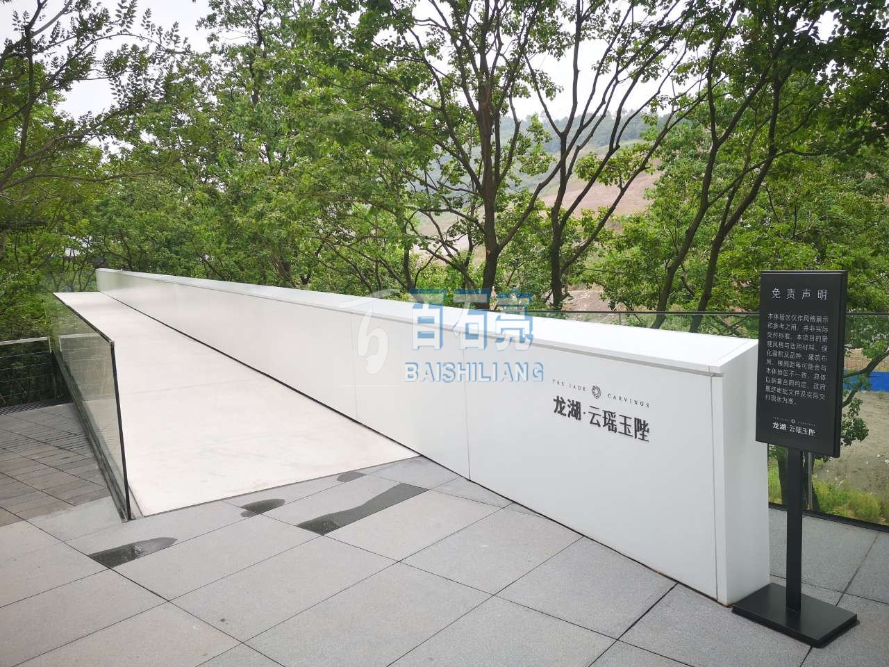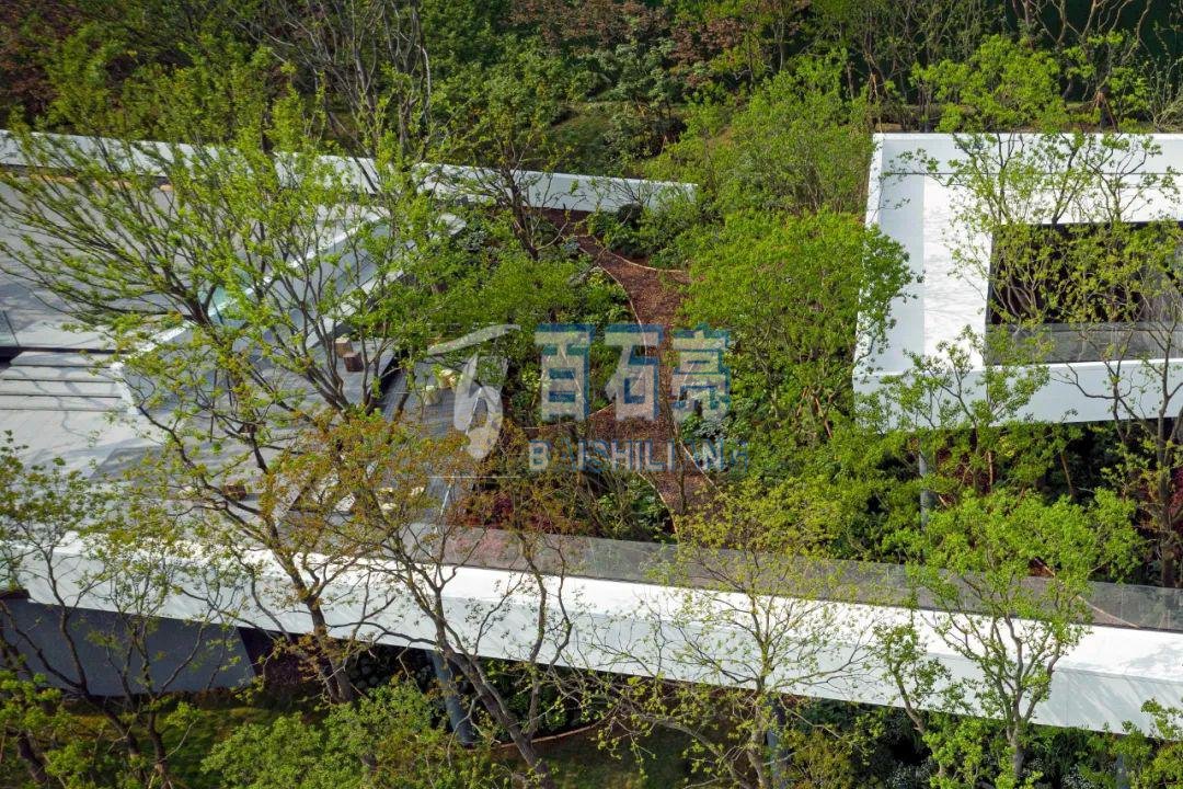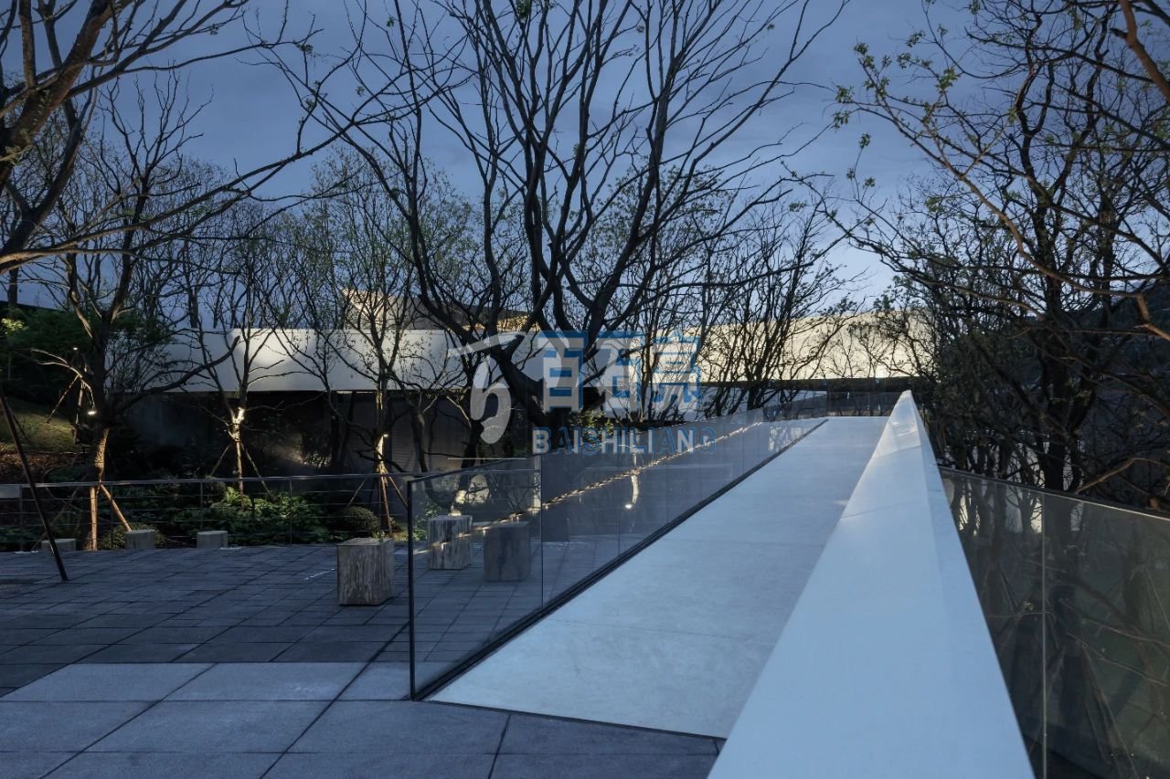 此項目位于重慶渝北區中央公園重慶龍湖龍湖.云瑤玉陛示范區,設計主題為白色為主,主材采用白色水泥+白色骨料。從遠處看白色水磨石好似山間的一抹“白云”,激活了山間的氛圍;白色水磨石又像一束柔白的光,指導著游人伴山而行。白色水磨石廊橋架于山坡之上,曲折蜿蜒,高低錯落與建筑統一融合。訪客在游走中,感受穿梭于樹梢上的野趣,運動將時間以它鮮活的流動狀態與空間連接,使他們能體驗到時空秩序感。