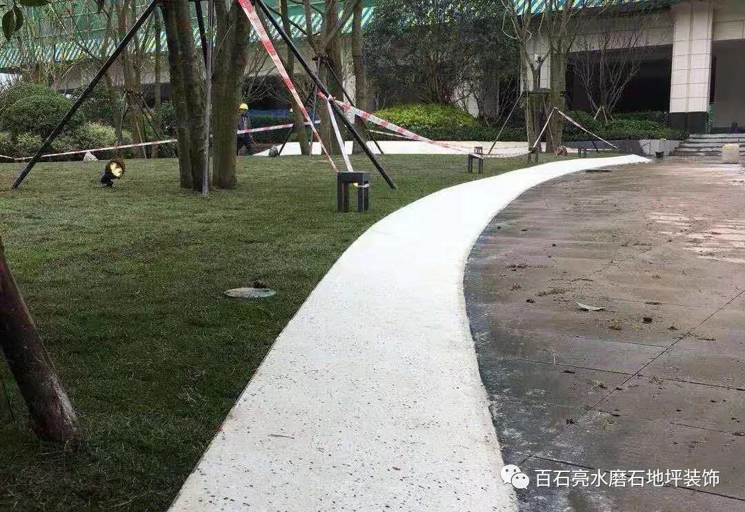 那么我們下面來欣賞一下百石亮水磨石施工團隊為融創九闕府打造的水磨石景觀工程! 這是小區內部小道旁的斜邊帶,白色打底,零星點綴黑色石子,給略顯沉悶的步道帶來了一絲活躍!