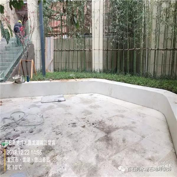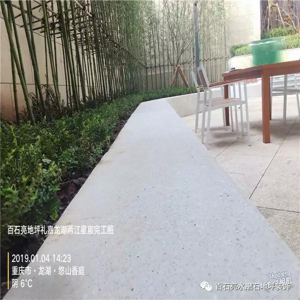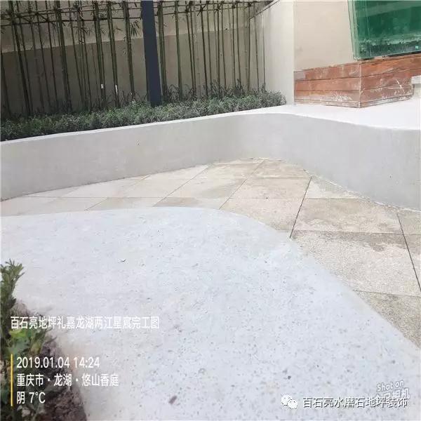 水磨石被我們在生活中廣泛的應用,它對惡劣環境適應性強,由于水磨石的制作獨特性,因此能夠有著很好地耐惡劣環境的性能,不開裂不怕重物壓、耐高溫、耐老化、耐污損等特性?,F在水磨石正慢慢的滲透到我們生活當中,接下來請欣賞由我們百石亮施工團隊帶來的龍湖兩江星辰景觀水磨石項目。