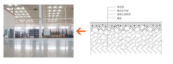 | 百石亮混凝土鋼化地坪結構圖 | 百石亮混凝土鋼化地坪滲透滲透原理剖面圖 |